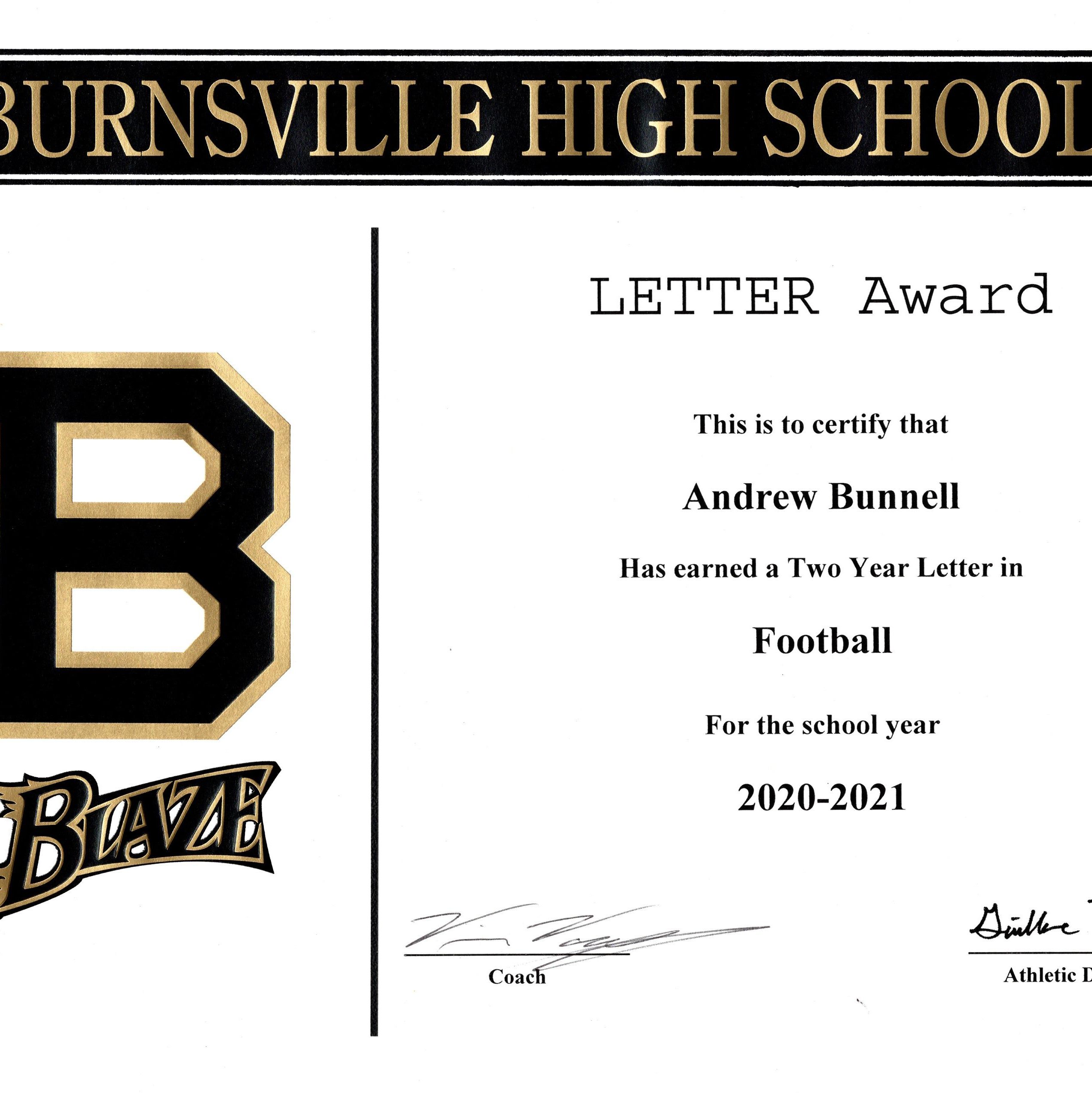 Andrew earned several letters over his career at Burnsville High School. Football, Student Council, National Honors Society, BurnsvilleStrong.