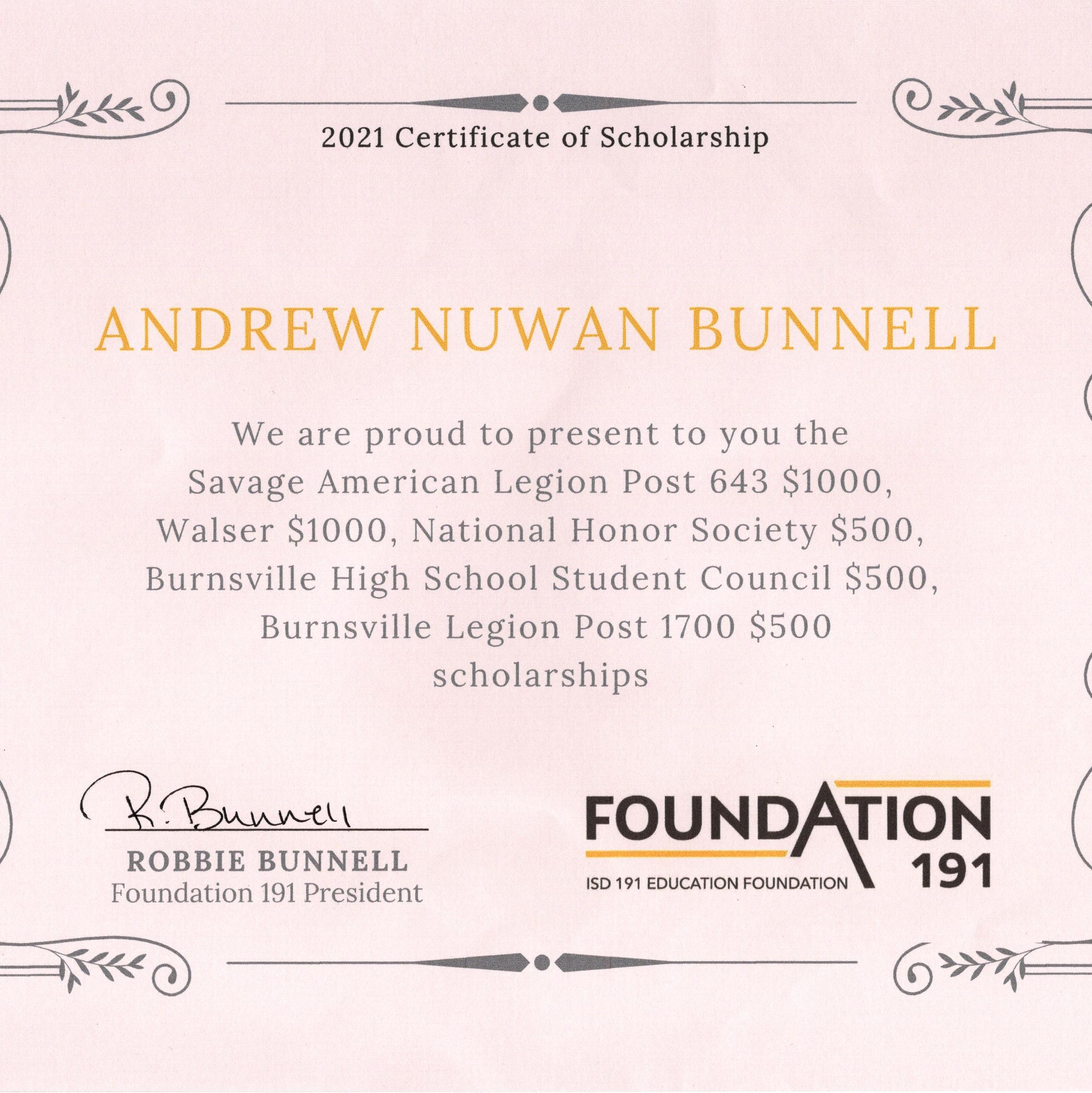 Andrew was selected as a scholarship recipient for the Dan Patch Post 643 Savage American Legion Scholarship Award in 2021.