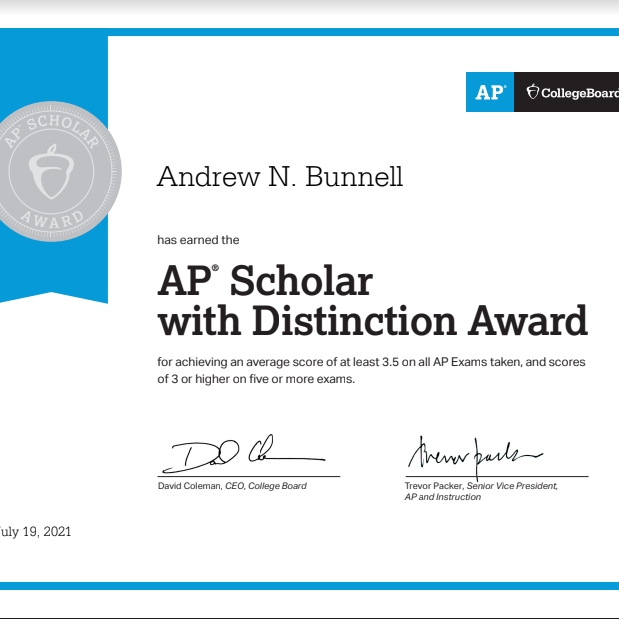 After taking 9 AP tests with average score above 4 on the test, Andrew was recognized by the College Board as an AP Scholar with Distinction.