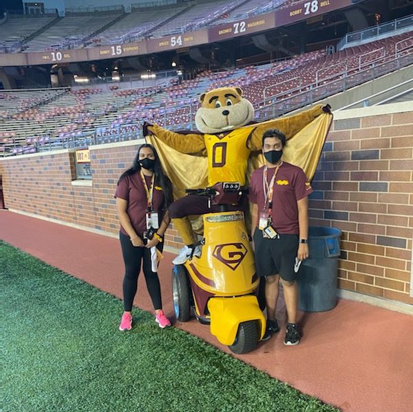 Andrew and Alexis posing with Goldy Gopher the U of MN school mascot!